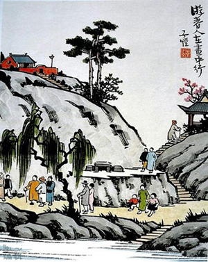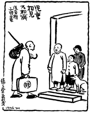 抗戰勝利后,由于交通困難,我家到1946年夏才從大后方回到江南。當父親第1次還鄉探望故里—浙江石門灣時,那里已成一片廢墟,不可復識。鄉親們看見父親一行人操著道地的石門灣土白邊走邊談時,覺得十分驚奇:這小鎮上怎么來了一群陌生人,說話卻全是本地口音!后來,父親聽見背后有人竊竊私語:“豐子愷!”“豐子愷回來了!”但父親一路走著,卻不見一個認識的人,因為這些人抗戰前都是孩子或少年,現在都已變成了成人。父親若想要認識他們,只有問他的父親叫什么。父親說,“兒童相見不相識,笑問客從何處來”這兩句詩,從前是談談而已,想不到如今自己做了詩中的主角!